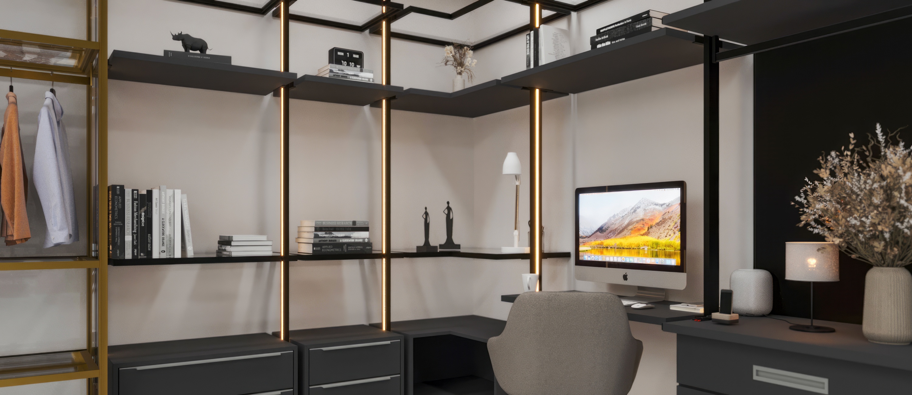 Armários com prateleiras modernas, compatíveis entre si e com opção de personalização em LED, pensados para criar ambientes funcionais, sofisticados e com identidade única. Design que se destaca em cada detalhe.